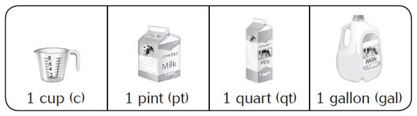 Estimate and Measure Liquid VolumeEssential Question How are cups, pints, quarts, and gallons related? UNLOCK the Problem You can use customary units to measure the amount of liquid a container will hold. Some customary units are cup (c), pint (pt), quart (qt), and gallon (gal).