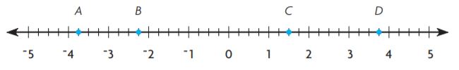 Which point on the graph represents \(^{-}3\cfrac{3}{4}\) ? What number does point C represent?