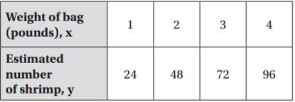Write an equation for the relationship shown in the table. Then use the equation to find the estimated number of shrimp in a 5-pound bag.
