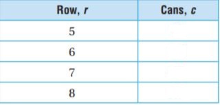 A grocery display of cans is arranged in the form of a pyramid with 1 can in the top row, 3 in the second row from the top, 5 in the third row, and 7 in the fourth row. The total number of cans c equals 2 times the row r minus 1. Use the equation c = 2r − 1 to complete the table.