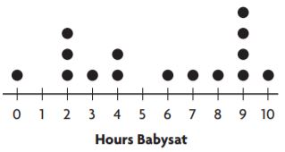 The dot plot shows the number of hours Mai babysat each week. How many hours is Mai most likely to babysit?