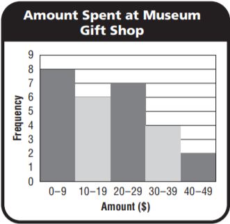 The histogram shows the amount, to the nearest dollar, that customers spent at a museum gift shop. How many customers spent less than $20?