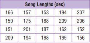 The table shows the lengths of the songs played by a radio station during a 90-minute period. Alicia is making a histogram of the data. What frequency should she show for the interval 160–169 seconds?